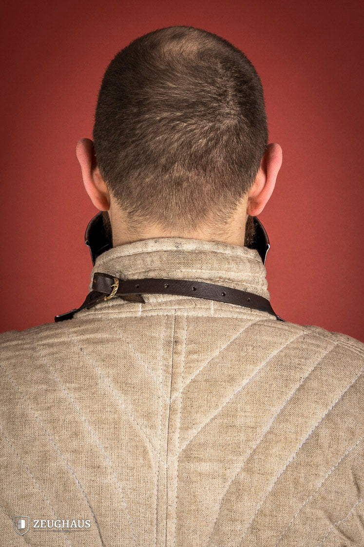 Inspired by models from the 15th century, our Polished Gorget with Bevor provides steadfast protection at the neck. The bevor, the piece of plate armor safeguarding the neck, can be adjusted for a defensive and secure fit. A leather strap is effortlessly attached at the back of the piece for a secure fit.