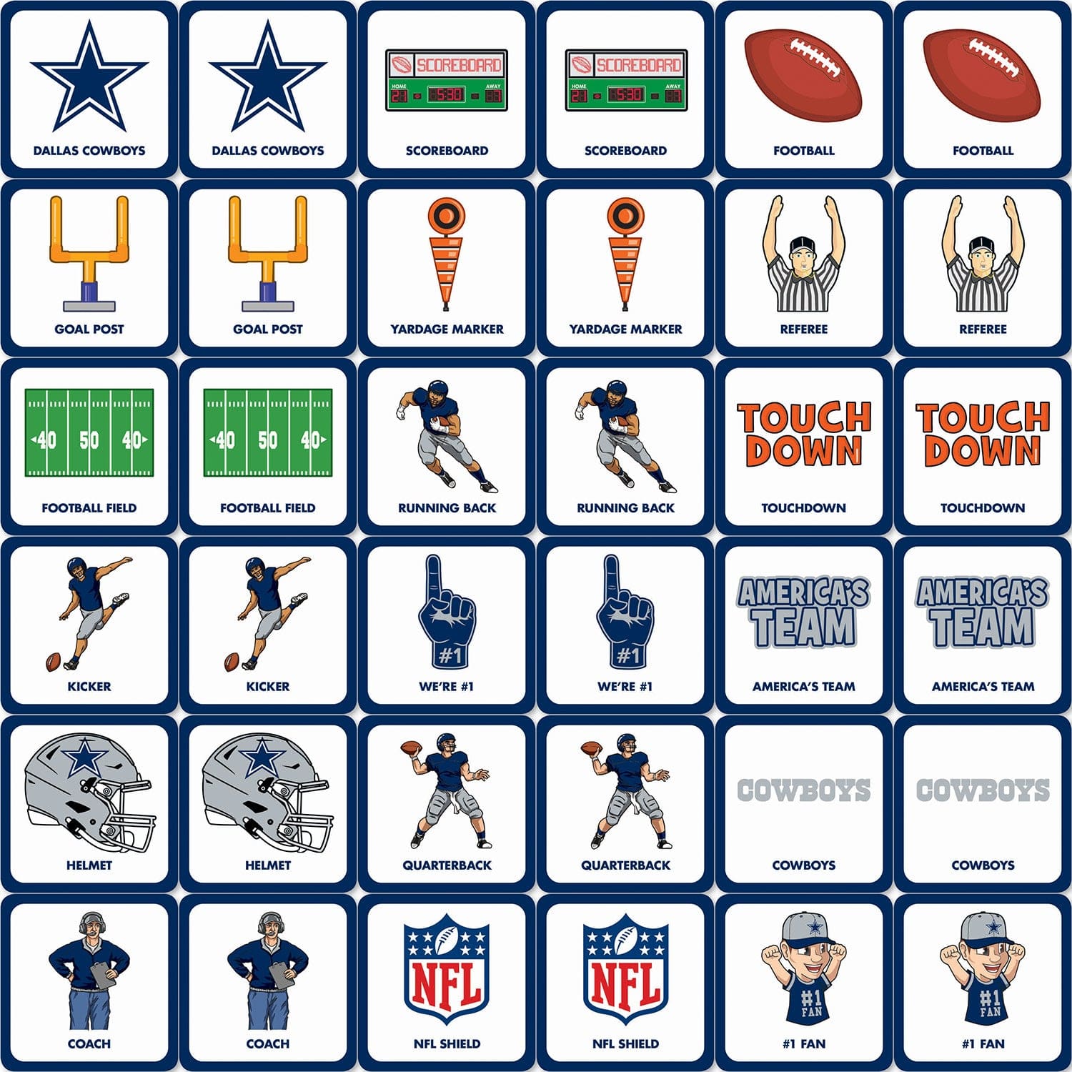 Looking for a fun way to spend some time with the family? Look no further than the NFL Dallas Cowboys Matching Game. This exciting game puts a sports spin on the classic matching game, and is perfect for children, adults, and families of all ages. With 18 unique pairs of symbols, it's sure to keep you entertained for hours on end. Plus, the officially licensed NFL picture cards are made with high-quality stock for durability and lasting enjoyment. So grab a partner and get ready to test your memory and sports knowledge with the NFL Dallas Cowboys Matching Game!