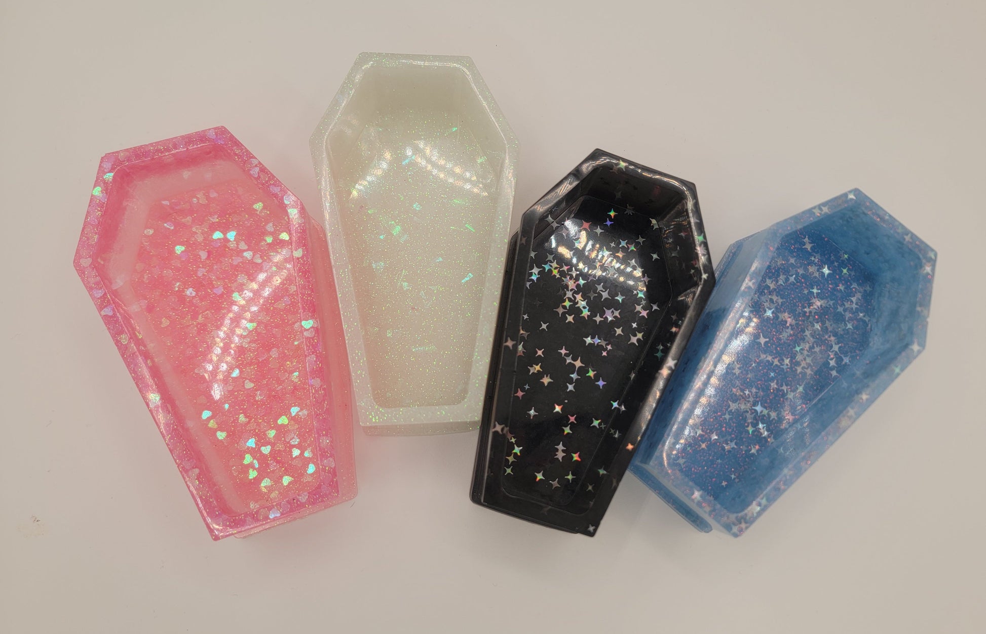 Elevate your gothic aesthetic with our Mini Coffin Trinket Dish. Made with high quality resin, this dish features sparkling glitter for a touch of drama. Perfect for holding jewelry or small trinkets, it adds a touch of macabre elegance to any space.