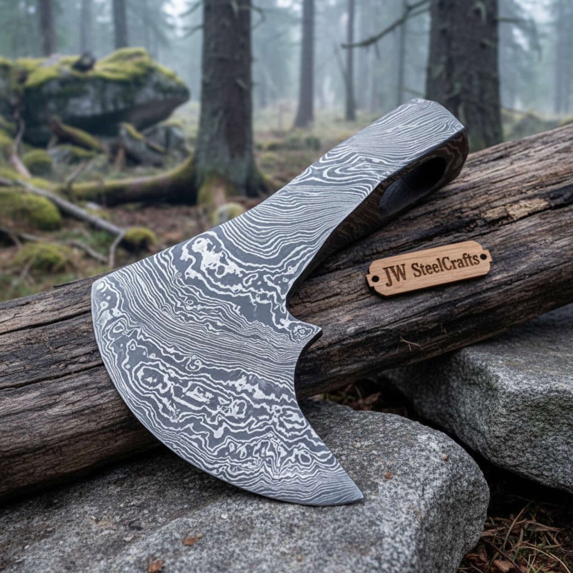 JW SteelCrafts forges layered high carbon steels under controlled heat and pressure. The repeated folding and welding process strengthens the structure and produces the visible flowing pattern across the blade face. Each axe head carries a distinct forged pattern.