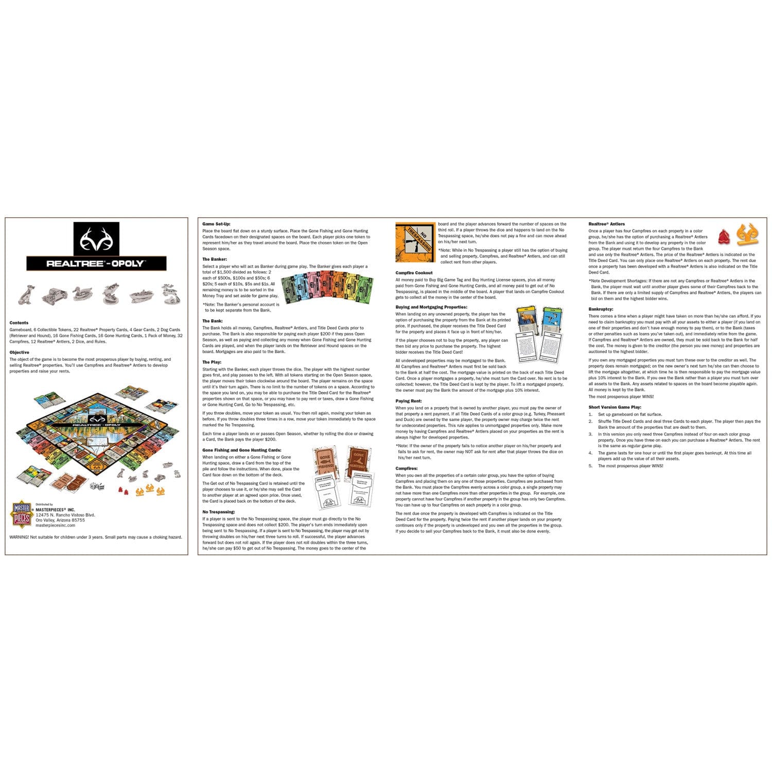 Includes: Game Board, 6 Collectible Metal Tokens, 22 Realtree® Property Cards, 4 Gear Cards, 2 Dog Cards, 16 Gone Fishing Cards, 16 Gone Hunting Cards, 1 Pack of Custom Money, 32 Plastic Campfires markers, 12 Plastic Realtree® Antlers markers, 2 Dice, and Rules