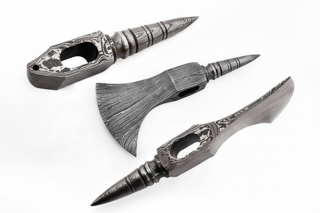 For a Damascus spike variation, view the 9 Inch Wide Double Bit Damascus Axe Head. If you prefer a mounted version with leather sheath, explore the Custom Handmade Damascus Steel Viking Axe with Leather Sheath. For a compact camp-ready build, see the Backcountry Survival Hatchet.